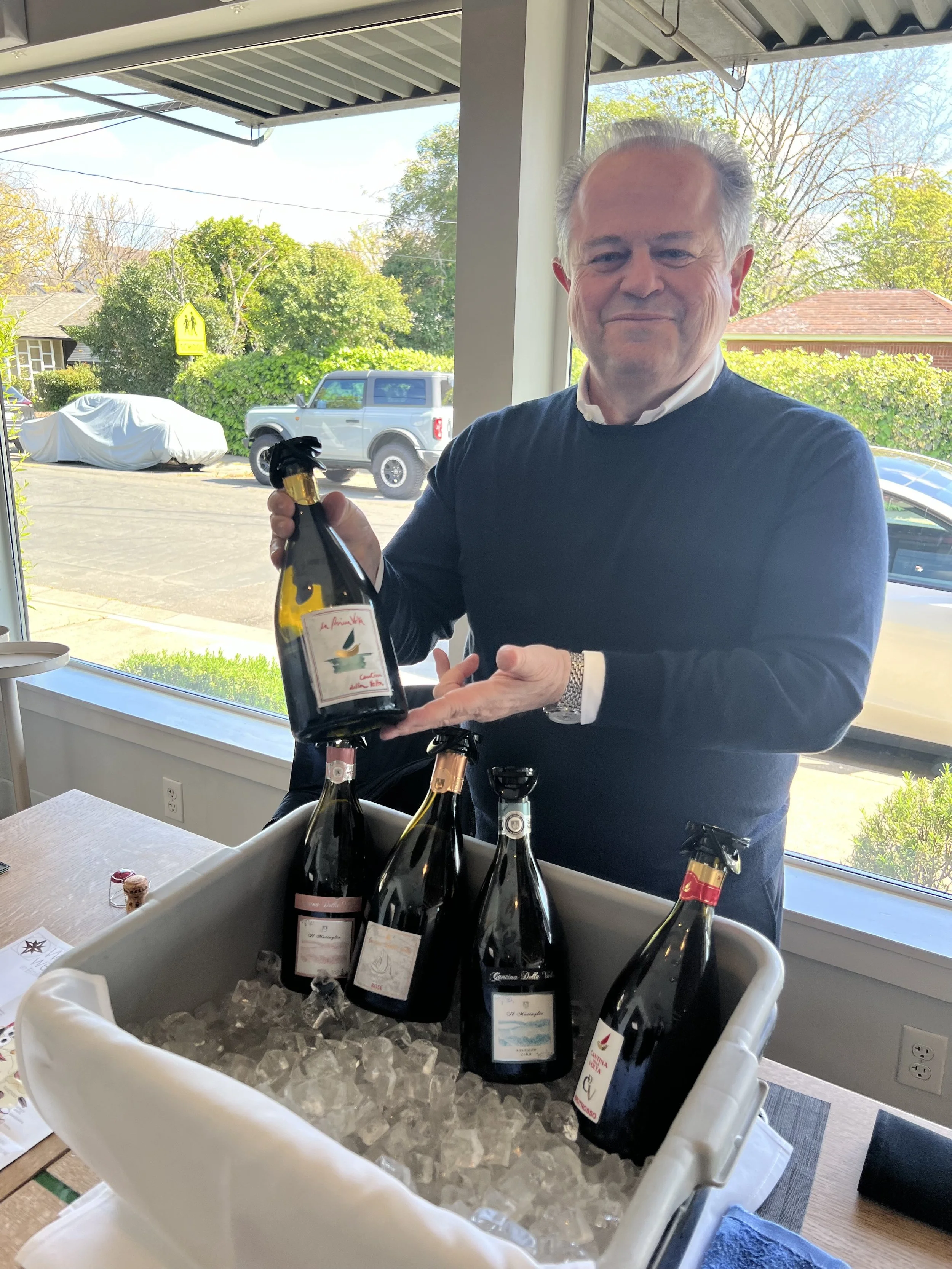 Giorgio Angiolini of Cantina della Volta pouring Lambrusco di Sorbara at Allora in Sacramento during a private tasting event, 2024.